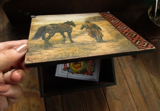 Inspirado en la escena cotidiana del gaucho y su caballo volviendo al hogar, este cofre está pensado para habitar espacios íntimos: mesas de luz, escritorios, bibliotecas.