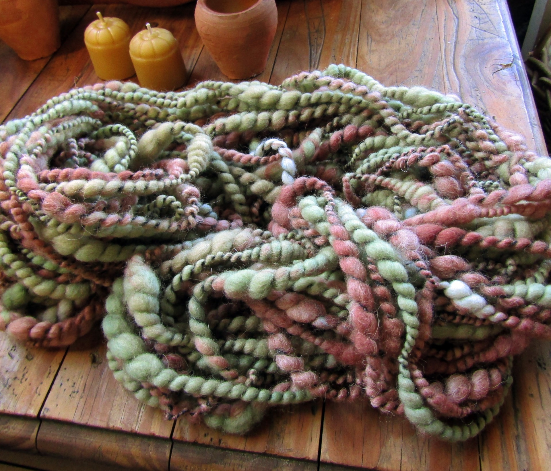 On the wheel I shaped what is known as art yarn: textured with playful curls, spirals, and "beehives" that celebrate the beauty of handmade touch..