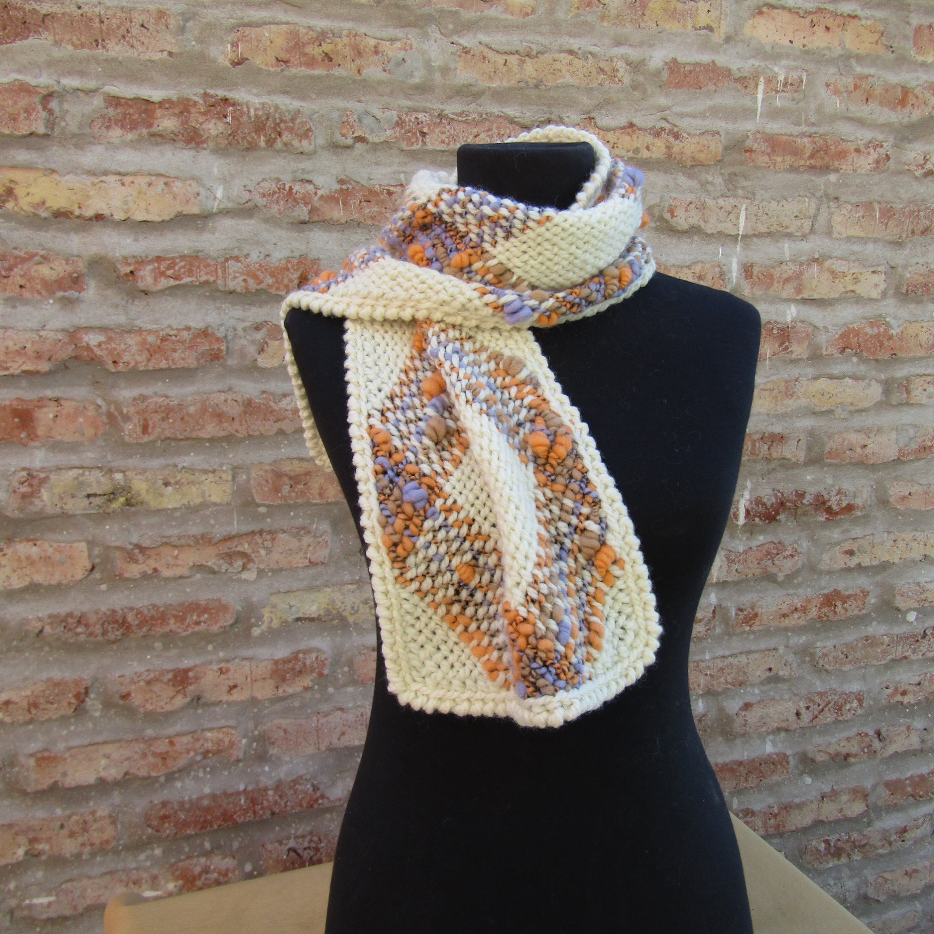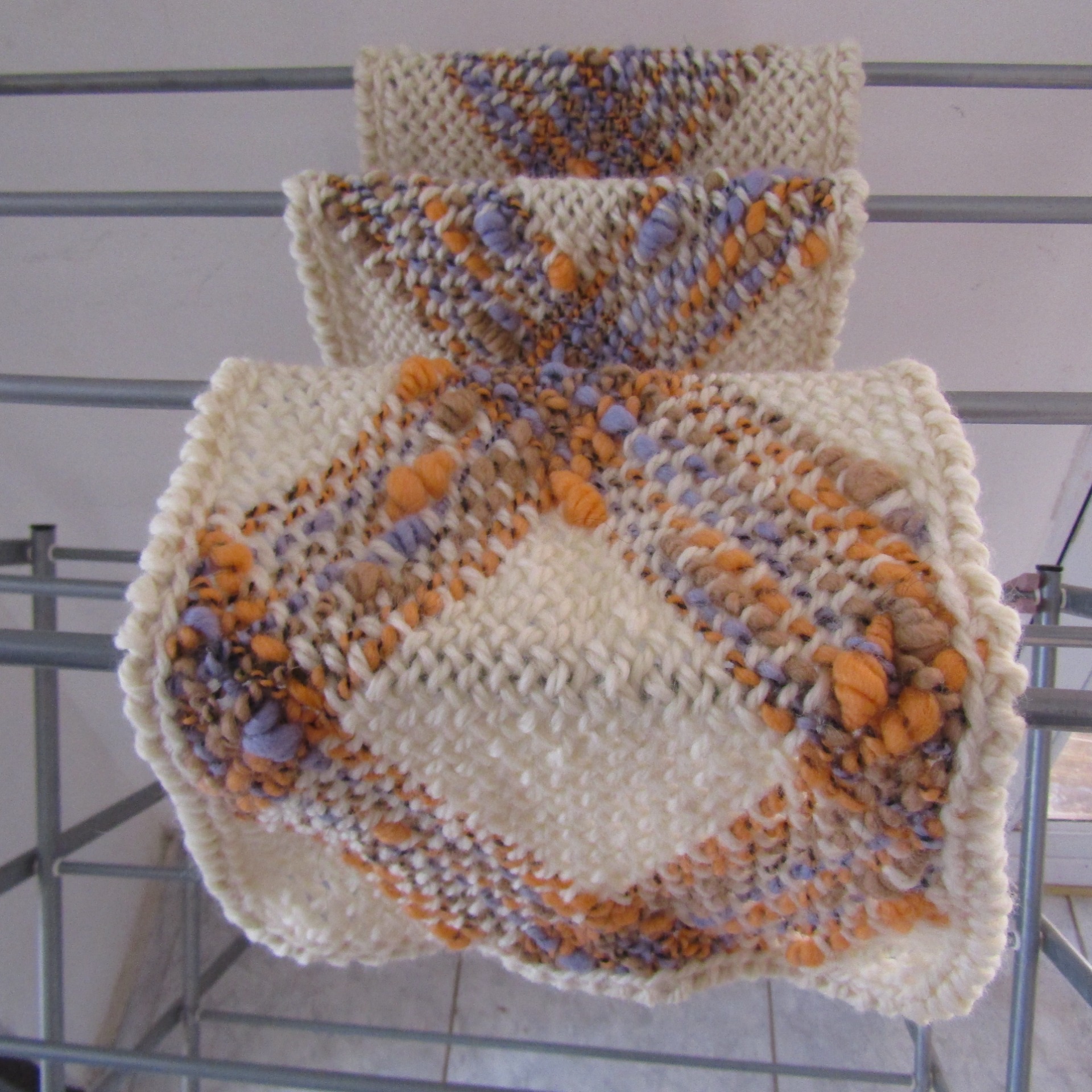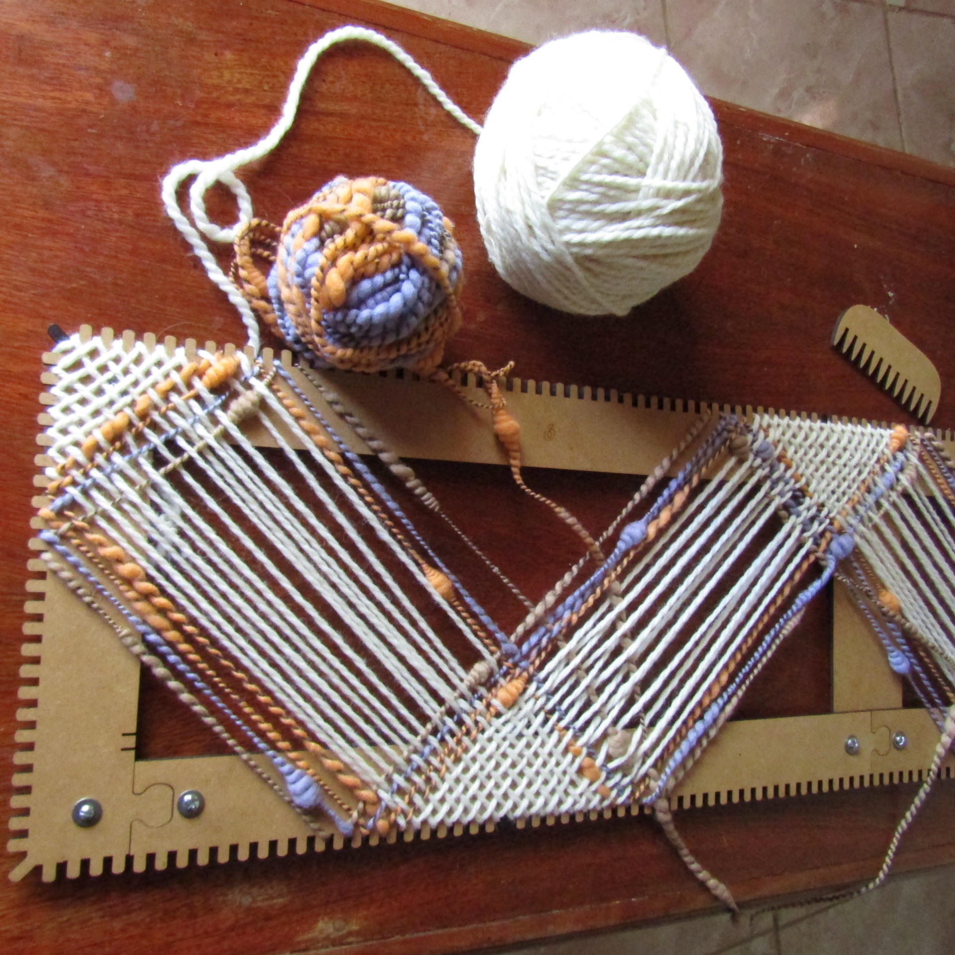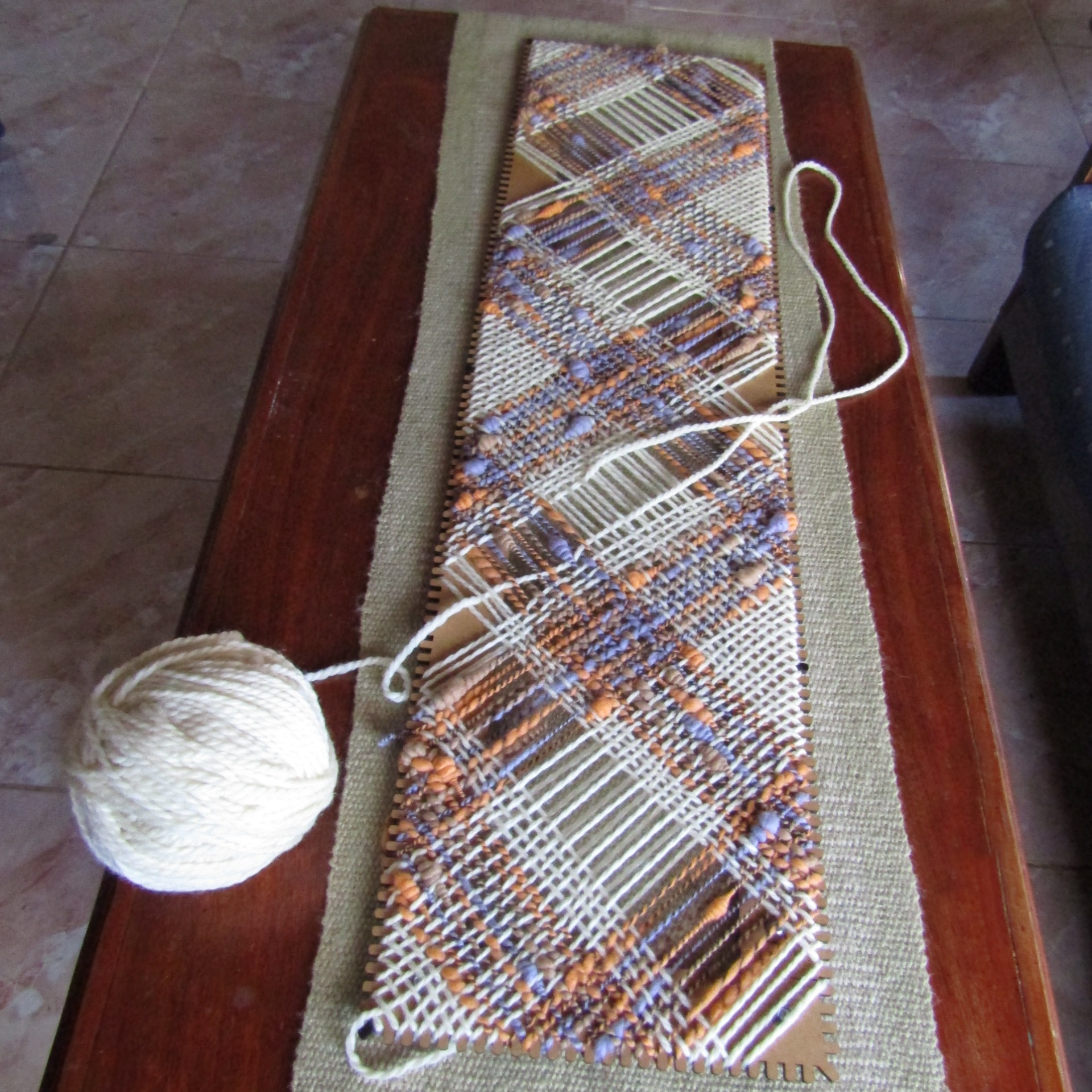 The magic begins when the first rows appear on the loom. Watch as the vibrant colors and whimsical curls of the art yarn zigzag neatly across the pure white merino canvas creating unique designs.