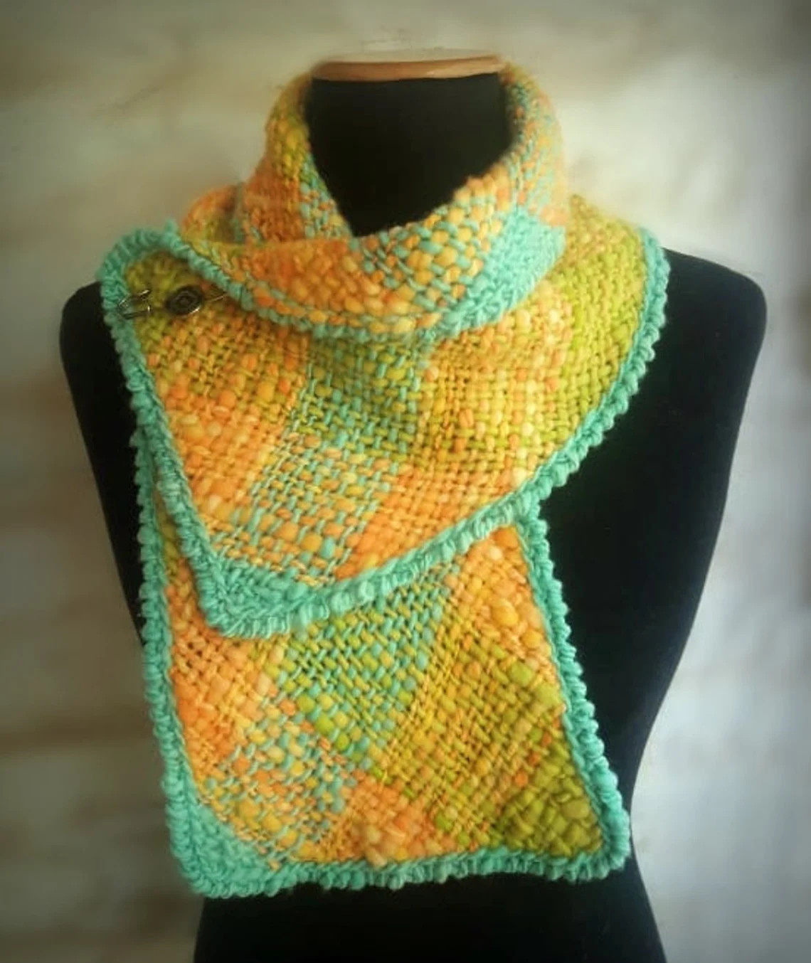 A very warm and comfortable handwoven scarf, designed to cross in the front and close with a pin or simply knot the ends.