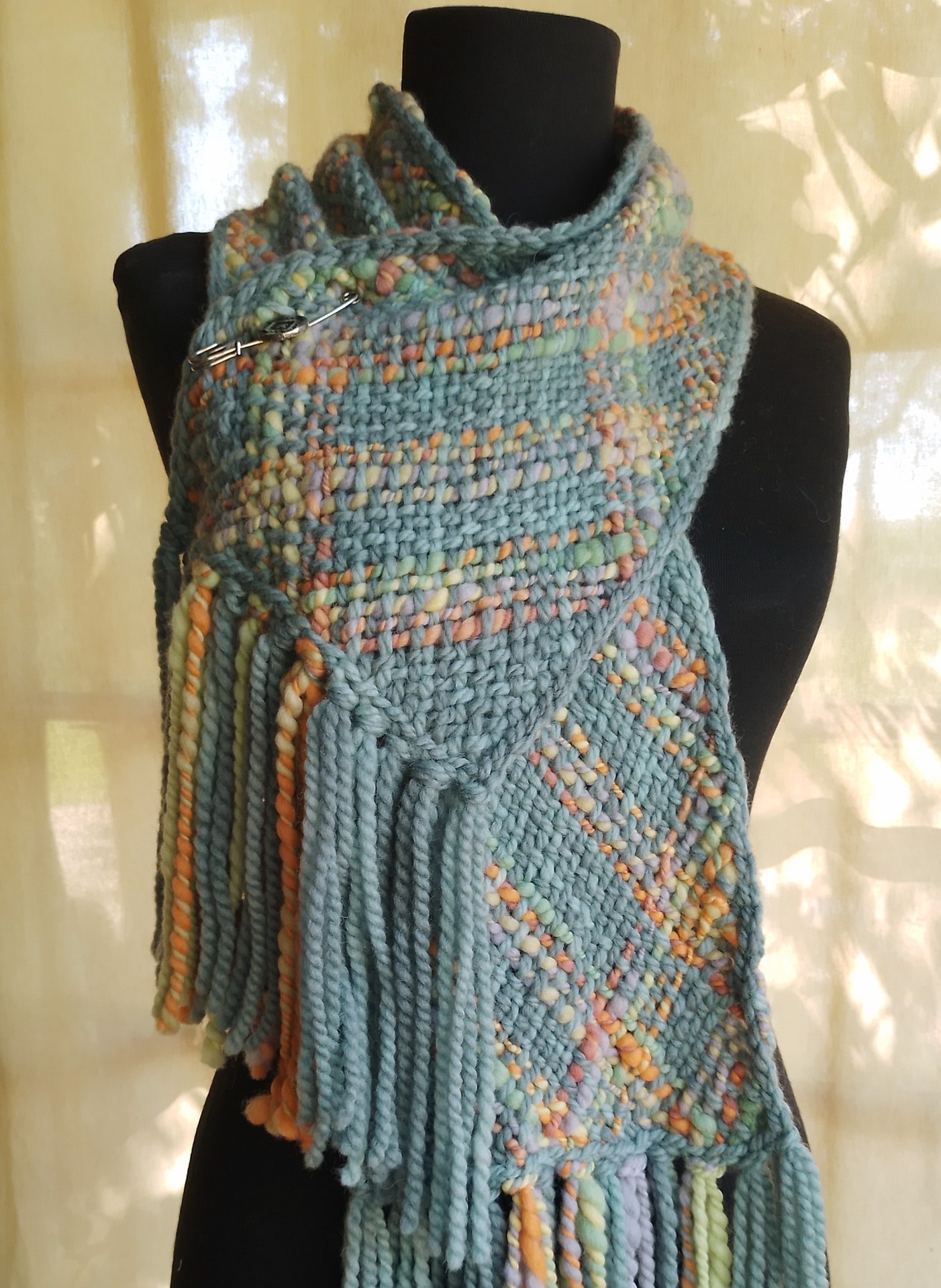 Handwoven scarf in merino wool & mohair with fringes. Unique neck warmer woven on the Travelling Loom. Free DHL shipping to America. Handmade in Patagonia.