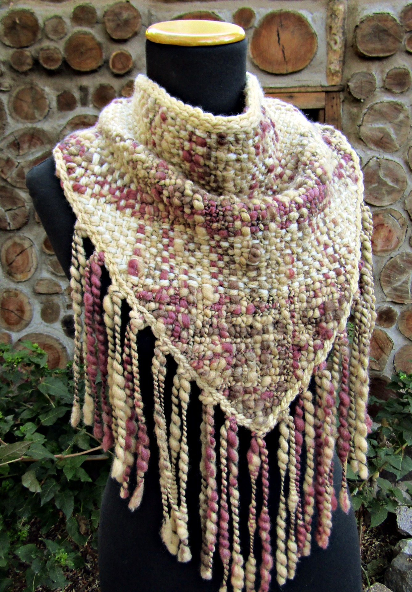 This piece was handwoven on a triangular loom (my Travelling Loom Brand) using 100% merino wool, spun into a textured art yarn.